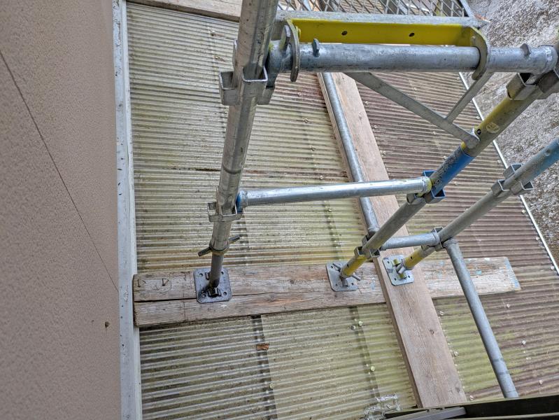 波板屋根は崩れてしまわないよう板を敷いてから足場を組みます。